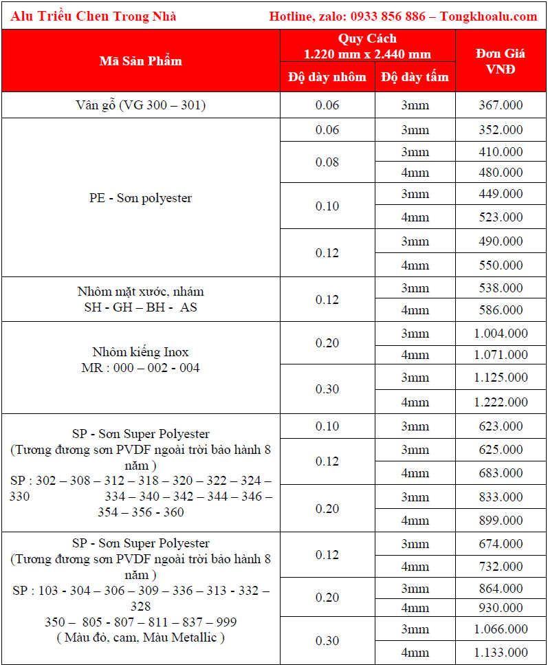 Thương hiệu alu giá rẻ sử dụng phổ biến trong nội thất và bảng biển quảng cáo, có các màu sắc cơ bản và màu vân gỗ.