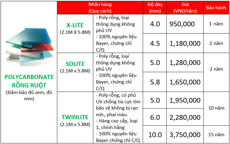Bảng Giá Tấm Lợp Poly Rỗng Ruột Mới Nhất